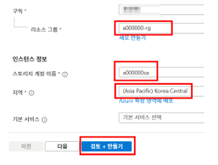 - 리소스 그룹, 스토리지 계정 이름, 지역 설정 후 검토+만들기