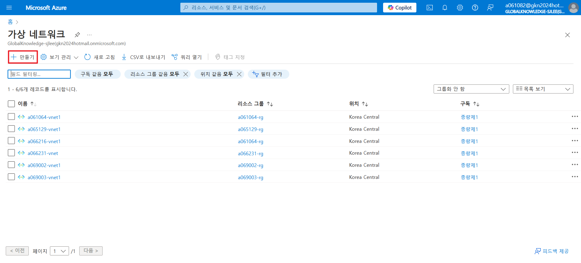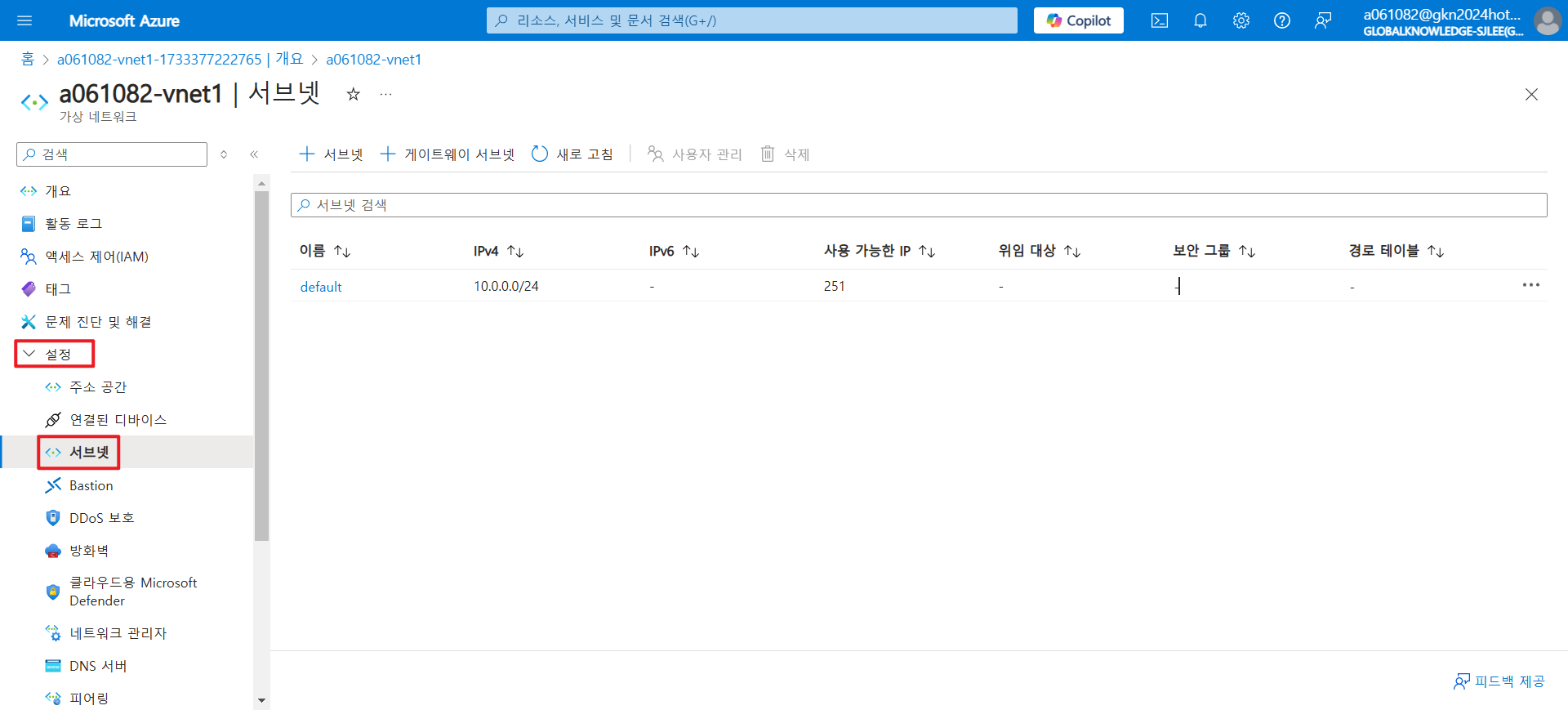 - 만든 가상 네트워크와 신규서브넷을 만들고