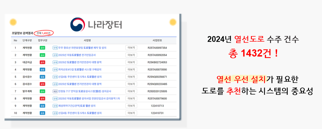 정부 사업 수주처인 나라장터에서도 열선 도로 설치 사업을 구하는 정도만 1432건이었기에 더욱 열선 설치가 필요한 도로를 추천하는 시스템이 필요하다는 결론을 내렸다.