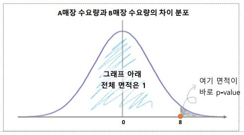p-value : 8을 기준으로 8보다 큰 분포에서 해당 하는 그래프 아래의 면적이 전체에서 차지하는 비율
