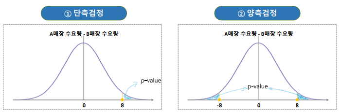 단측 검정 : 어느 매장의 수요량이 더 큰가?