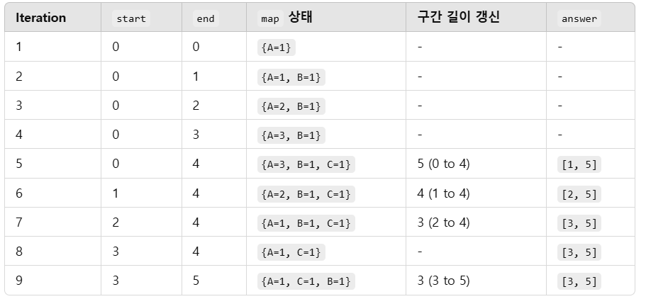 3종류의 보석(AA, AB, AC)을 모두 포함하는 가장 짧은 구간은 [1, 3], [2, 4]가 있습니다.